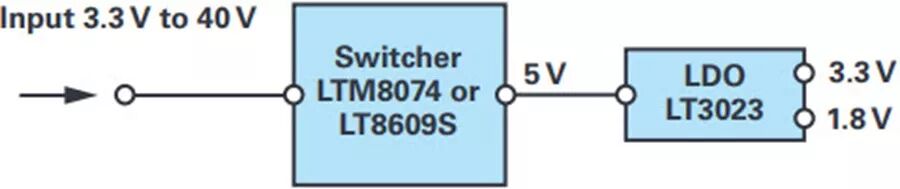 在图1所示的电源方案中,LDO稳压器用于从15 V电压降至5 V/3.3 V电压。这并非是生成这些低电压轨非常有效的方式。使用Silent Switcher、μModule稳压器 LTM8074提高降至更低电压的高效率解决方案如图3所示。