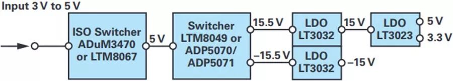 图2. 具有低电源纹波的隔离双极性电源系统的电源解决方案。