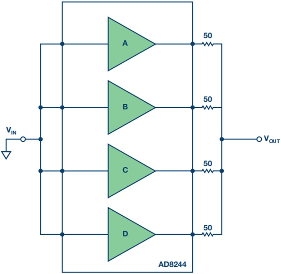 在图1所示电路中,各通道的电流噪声极低(0.8 fA/√Hz);相比之下,电压噪声则有(13 nV/√Hz)。因此,要降低系统中增加的噪声,必须降低此电压噪声。并联放置多个缓冲器可降低电压噪声。例如,两个缓冲器并联可将电压噪声降低√22, 芯片采购平台所有四个缓冲器并联相当于一个噪声减半的缓冲器。这种方法的缺点是偏置电流、电流噪声和输入电容提高,但在本例中, 这些效应可忽略不计。在输出之间放置一个 50 Ω之类的小电阻,可防止各输出之间的细微差异引起的额外电流流动。对于对功耗不太敏感的应用,可以省去这些 50 Ω电阻以提高可用输出电流。
