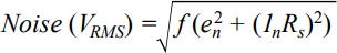 en = 缓冲器输入电压噪声密度in = 缓冲器输入电流噪声密度f = 器件输入带宽(Hz)