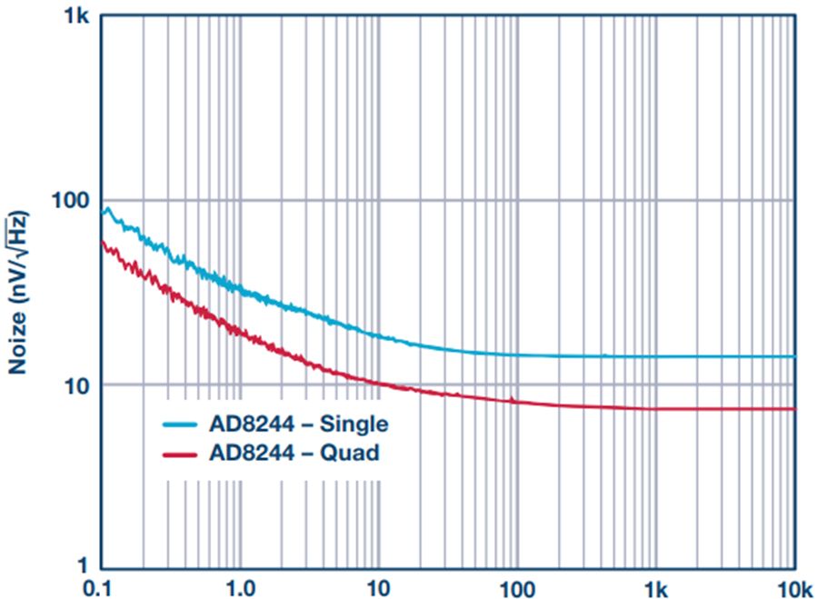 图2. 新型缓冲器AD8244的性能:噪声仅为普通缓冲器的一半