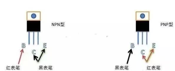 找出这只三极管的基极引脚之后,就可以根据基极与另外两个电极之间PN结的方向来确定该只三极管是PNP型还是NPN型。 将万用表的黑表笔连接到该只三极管的基极,红表笔连接到另外两个电极中的任何一个,如果表头指针偏转角度很大,则说明这只三极管是NPN型三极管, 电子元器件采购网 如果表头指针偏转角度很小,说明这只三极管为PNP型三极管。 3 顺箭头,偏转大